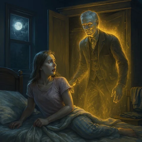 كنت مضجعة على جنبي فأدرت ظهري لأعرف مصدر الصوت فأدركت أنه يأتي من أبواب الخزانة التي كانت مفتوحة ولم يكن معي أي أحد في الغرفة، كان الظلام مخيماُ باستثناء ضوء القمر الظاهر من النافذة، فرأيت شخصاً يخرج من الخزانة وباتجاهي ! ، كان شفافاً ويشع بالضوء! ثم توقف عند طرف السرير ونظر إلي لبرهة امتدت لحوالي الدقيقة ، فزعت لما رأيت ولم أستطع التحرك لشدة دهشتي وخوفي، ثم قام بالتقاط بنطالي الذي كان على حافة السرير ووضعه على الكرسي المجاور لسريري وحدق بي مجدداُ ، وعندما بدأت بالصراخ دخلت أختي الغرفة وأضاءت الأنوار فاختفى ! ، ثم خرجنا فوراُ من الغرفة إلى غرفة الجلوس عبر المطبخ وجلسنا على الكنبة ثم عاد "الشبح" ليظهر أمامنا ثانية فاختبأنا خوفاً خلف الكنبة ثم شعرت أن علي الذهاب للحمام لقضاء الحاجة فرافقتني اختي إلى الحمام فوجدناه للمرة الثالثة في الممر المؤدي إلى الحمام وكان جامداُ في مكانه ولم يفعل شيئاُ فركضنا بسرعة إلى الحمام وبعد أن قضيت الحاجة خرجنا من الحمام وبدا لنا أنه اختفى !نام ثلاثتنا في تلك اللليلة المروعة في نفس السرير، كل ما أذكره عن ذلك "الشبح" أنه كان رجلاً طويلاً معالمه غير واضحة ولكن يبدو الشيب على شعره الأسود والقصير، كانت ملابسه قديمة الطراز ، كان وجهه جامداً ولم تظهر على محياه أي ابتسامة، وللعلم بني ذلك المنزل في العشرينات من القرن الماضي ، وحدث أن تكررت تلك المشاهدات الغريبة (تجسدات Apparitions) لذلك "الشبح" ولمدة سنتان منذ اللحظة التي انتقلنا فيها إلى ذلك المنزل وحتى مغادرتنا إياه والغريب في الأمر أن تلك المشاهدات اقتصرت علي وعلى أختي إذ لم يظهر أو يضايق أمي و أخواتي الأصغر منا سناً، أحياناً تنقطع تلك المشاهدات لمدة شهر كامل أو أحياناً أخرى تحدث لعدد من الأيام المتتالية، كنا نلاحظ أن الأبواب تفتح بعد أن أغلقناها وذلك عند مغادرتنا للمنزل وعودتنا إليه، وعندما كنا نضع أطباق الطعام على الطاولة، تهتز الأطباق ووتتكسر على الأرض !