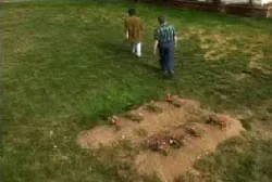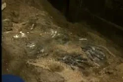 م إن كان يمزح أم لا. كما لم أفهم كيف يمكن لشخص أن يمزح بشيئ كهذا". وفعلاً قرر سام أن يختبر ادعاءات وتحذيرات الرجل العجوز فاستخدم آلة Backhoe (شاحنة تستخدم لعمل الحفر في الأرض) فلم يمض سوى زمن بسيط حتى اصطدمت الحفارة بشيء أثناء الحفر وعند تلك النقطة توقفنا عن الحفر ونزلنا للأسفل داخل الحفرة وتابعنا الحفر بيدينا فعثرنا على ألواح من خشب الصنوبر وعندما رفعنا تلك الألواح كان باستطاعتنا رؤية آثار هيكل عظمي ولم يمض فترة طويلة حتى تأكدنا من أنها بقايا بشرية. كما عثرت عائلة ويليامز أيضاً على بقايا مماثلة لقبور في نفس المنطقة، فاتصل سام فوراً بالشرطة فانتشلت الشرطة تلك البقايا، كانت العظام هشة لدرجة أنها تتحول إلى مسحوق بودرة عند انتشالها، لكن عثر على 25 جزءاً كانت من الهشاشة إلى درجة أنها تتبعثر أجزاؤها بمجرد لمسها. وعثر أيضاً على كفن ثان ب