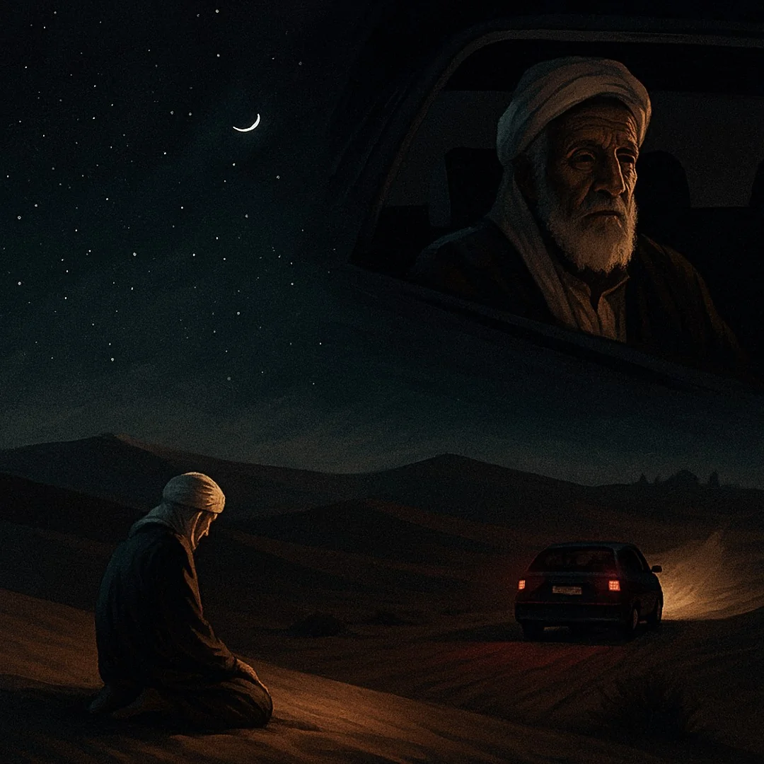 في الواقع انتابني الخوف حينما أقتربت من ذلك الرجل الذي كان يرتدي زي سكان الصحراء ويلبس عمامة على رأسه، كنت اقتربت بحذر في حين بقى صديقي داخل السيارة والمحرك شغال احتياطاً لأي طارئ، حاولت إخفاء مشاعر الخوف وقلت له بنبرة طبيعية: " السلام عليكم...." ، ويأتي الرد : "وعليكم السلام ورحمة الله وبركاته." وفي تلك اللحظة بالذات ذهب كل خوفي ، فقلت له : " هل من حاجة أقضيها لك ؟ ، هل من مساعدة أقدمها لك ؟ " ، فرد علي بنبرة آمرة : " اذهب في حالك ياولدي " ، عندها استدرت لأعود للسيارة فأذا به يناديني باسمي ! ، لم أعرف كيف أمكنه معرفة اسمي ، وقال : " أوصلني إلى المسجد القديم ..." ، في الواقع وافقت على طلبه رغم عدم معرفتي بمكان الجامع القديم ، فأين أجده وسط هذه الصحراء القاحلة، قام الرجل وهو يسير ببطء شديد فمددت يدي ومسكت يده اليسرى فإذا هي باردة إلى حد كبير رغم أننا في درجة حرارة لاتقل عن الخامسة والثلاثين ليلاً ، وحينما اقتربنا من السيارة تمعنت في وجهه فإذا به شيخ طاعن في السن وقدرت أنه في الـ 85 ، ركب في المقعد في الخلفي رافضاً عرضي بالركوب في المقعد الأمامي وانطلقنا في طريقنا ونحن لانعلم أين هو المسجد القديم وخلال ذلك لم نسمع من ذكل الشيخ سوى تكراره " لاإله إلا الله الدنيا تفنى ويبقى الله" ، حاولت كسر الجمود فقلت:" بالله ياحاج ادعو لنا" ، فقال لي :" أصبر ياولدي" ، وقلت له ادعي لصديقي عبد السلام فقال :" لما يترك الخمر... لما يترك الخمر" ، سبحان الله كان صديقي لايفوت جلسة خمر ولا معاشرة النساء ! أدهشنا ذلك كثيراً ومضت بقية الطريق والشيخ لايصمت عن توحيده، وبعد حوالى الخمسين كيلو متر بدأت تظهرلنا بعض الأضواء وعدد من أشجار النخيل المتناثرة هنا وهناك وكان أول ما ظهر لنا هو صومعة مسجد قديم وبعض البيوت الصغيرة فأشار الشيخ بيده إلى المسجد مباشرة.