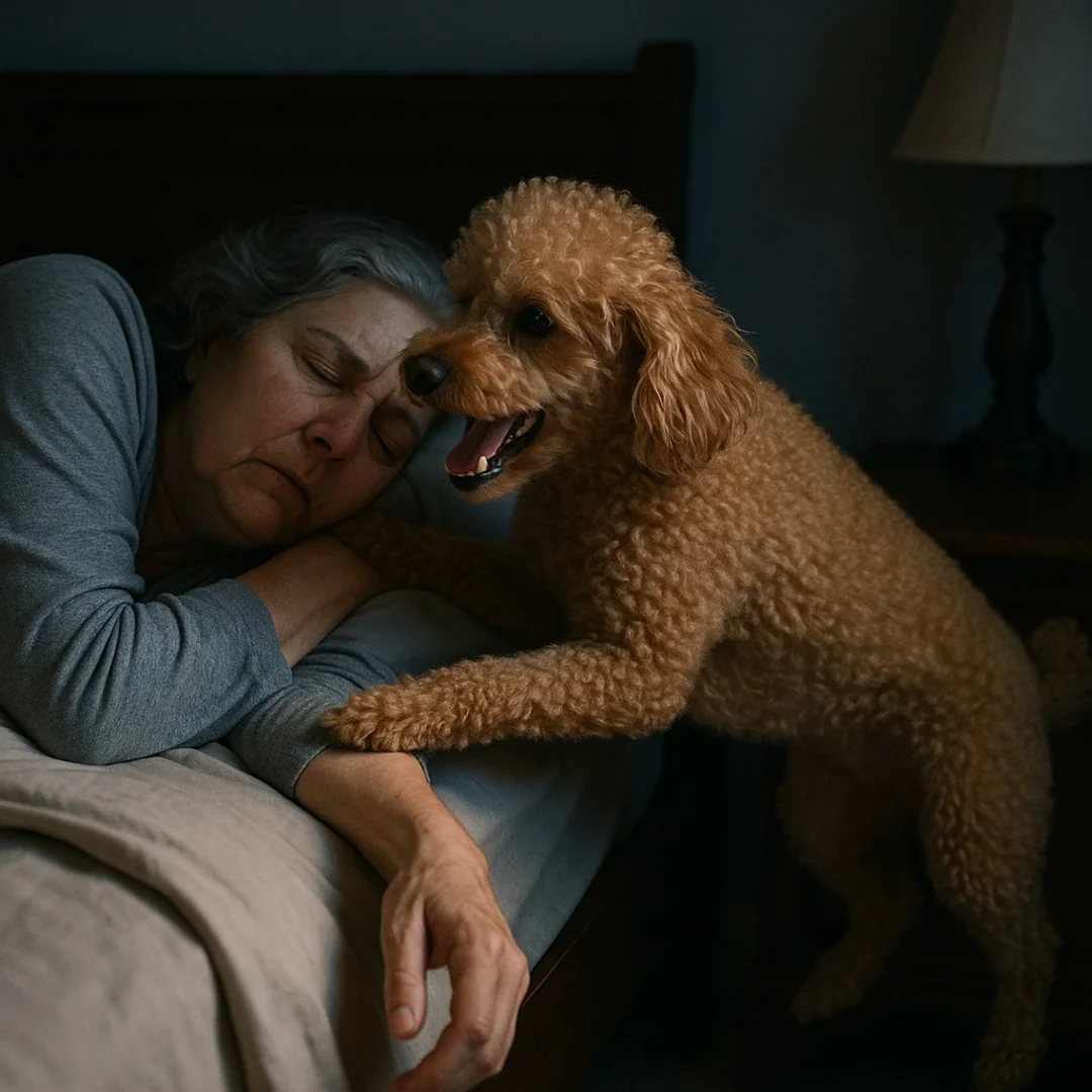 بعد مرور بضع ساعات، استيقظت أمي من نوم عميق على صوت كلبنا الصغير، من نوع بودل بني اللون، يُدعى "براندي". وكعادته، كان نشيطًا للغاية، لكنه هذه المرة كان يُصرّ بإلحاح على الخروج. ومَن يربّي الكلاب يعرف: إن أصر الكلب على الخروج، فالأفضل أن تدعه يخرج فوراً قبل أن تُضطر إلى تنظيف آثار ذلك.