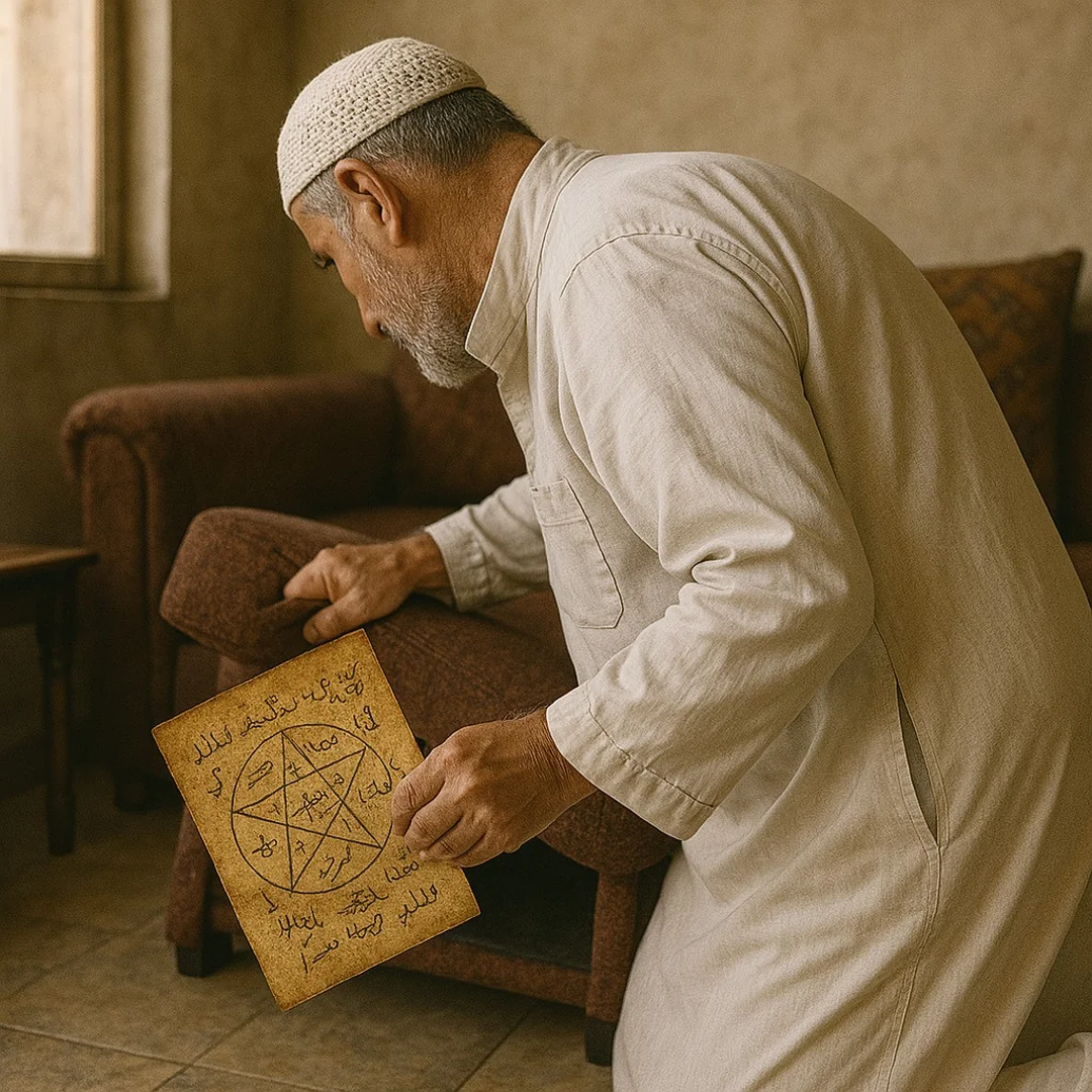 في إحدى المرات، اتهمني زوج الجارة المؤذن بكسر مصباح في الممر، رغم أني لم أفعل، ثم هاجموا والدي بعنف عند محاولته الدفاع عني. جلب والدي شيخاً، وبعد تفتيش البيت، عثر على ورقة مخفية في باطن الأريكة تحتوي على طلاسم وكلمات مثل: "موت، مرض، ترحيل، هم...". تخلص الشيخ منها في البحر ووضع حجاباً في المنزل. ومع المواظبة على قراءة القرآن، بدأت الأمور تتحسن تدريجياً.